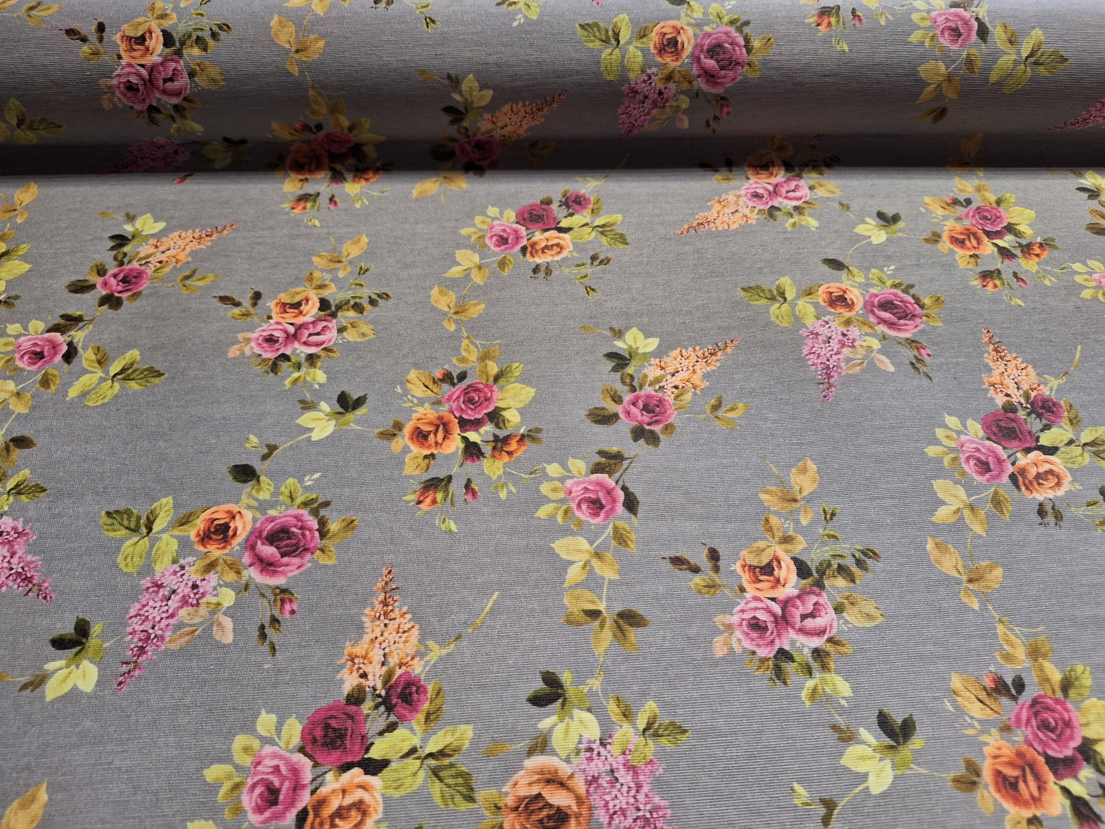 Szürke alapon rózsás letörölhető textil terítő